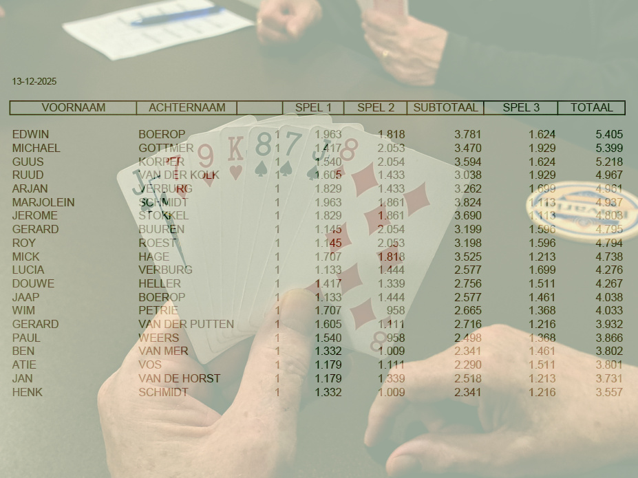 Op 24 november was er het door Mick en Gerard georganiseerde klaverjas toernooi: Donderdagavond om 20.00 uur verzamelden zich 12 spelers voor weer eens een